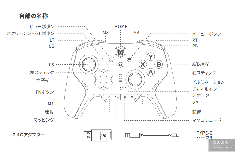それぞれのボタン説明はこんな感じです。中央下のマクロボタンやマッピングボタンを押すことで設定を瞬時に変えられて便利です。