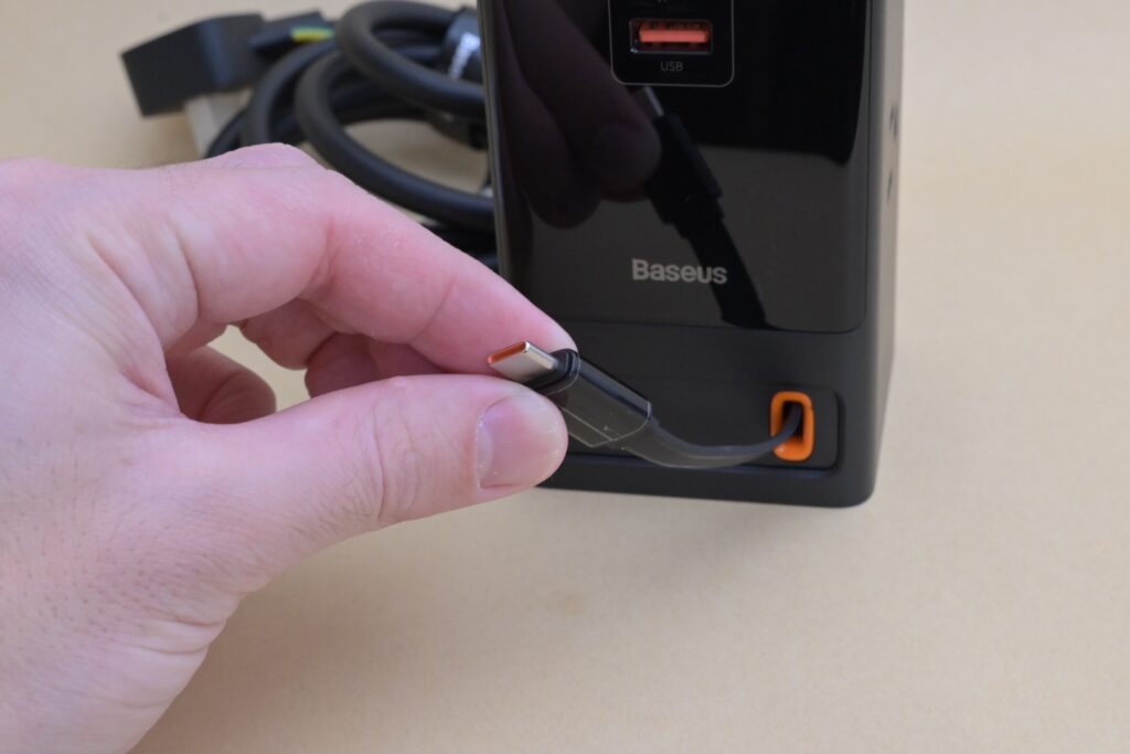 この電源タップはデスク上の電源サイトとして重宝してて、Type-Cケーブルが内蔵しているのでケーブルを引っ張るだけで使えるし、コンセントも直差しで使えます。