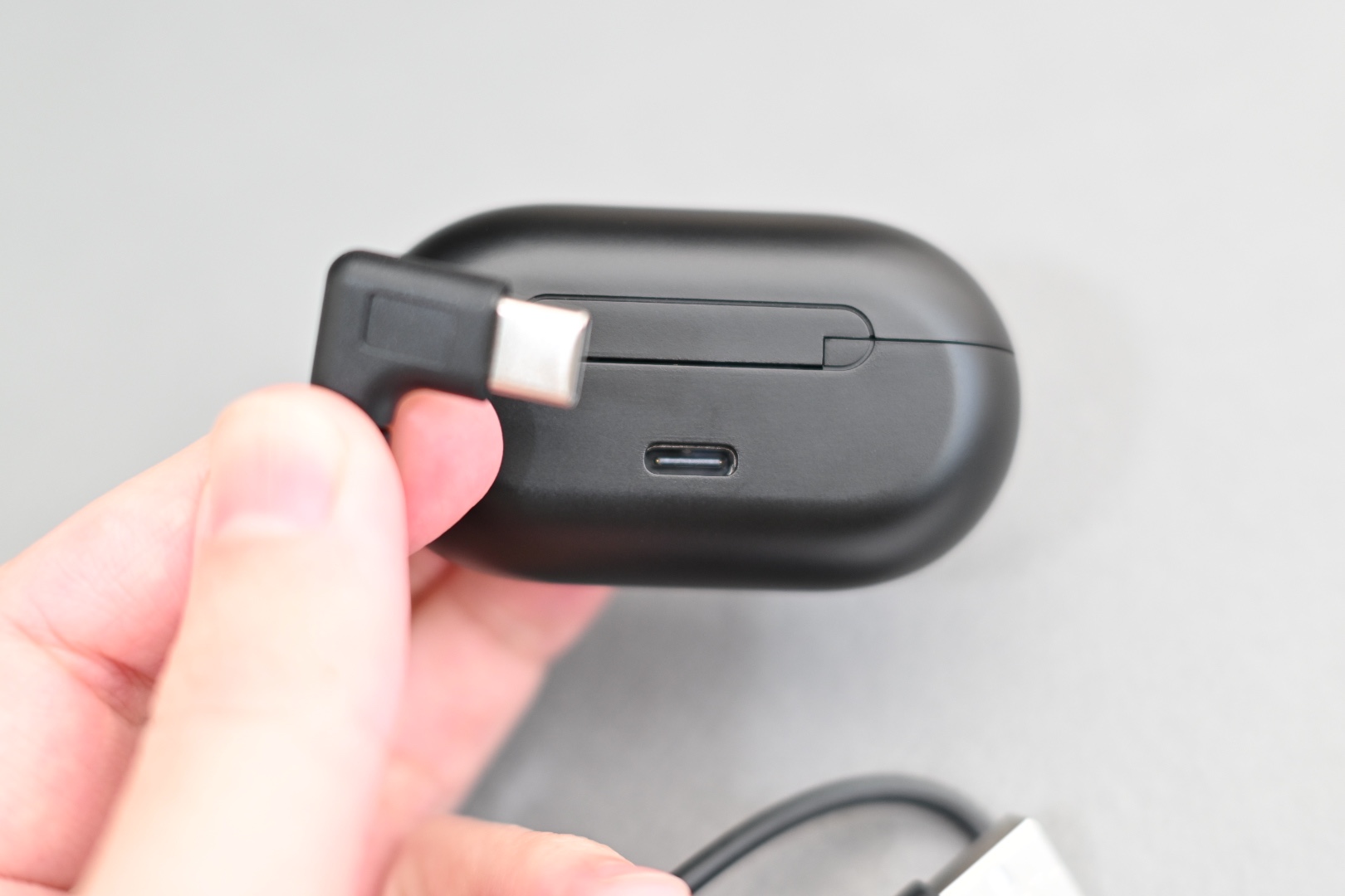 充電は本体ケース後ろ側にType-Cケーブルを差し込む穴があるので、そこから充電が可能です。