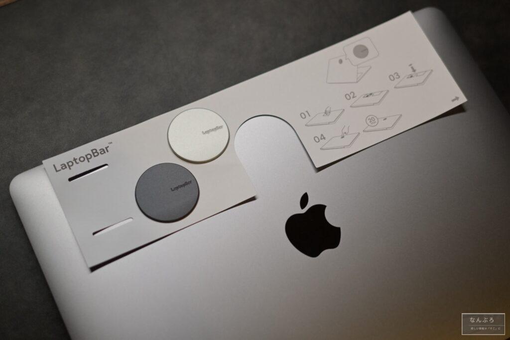 まず、付属のクリーニングクロスでノートパソコンを拭いた後に付属のシール(色違いが2枚あります)をノートパソコンに貼り付け、20分ほど待ちます。