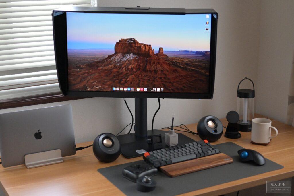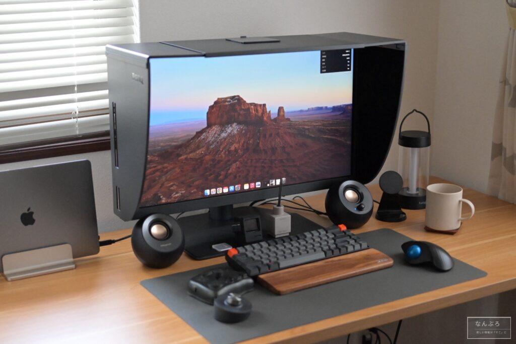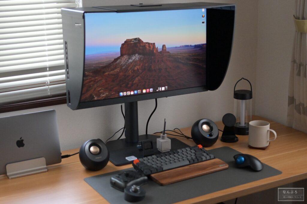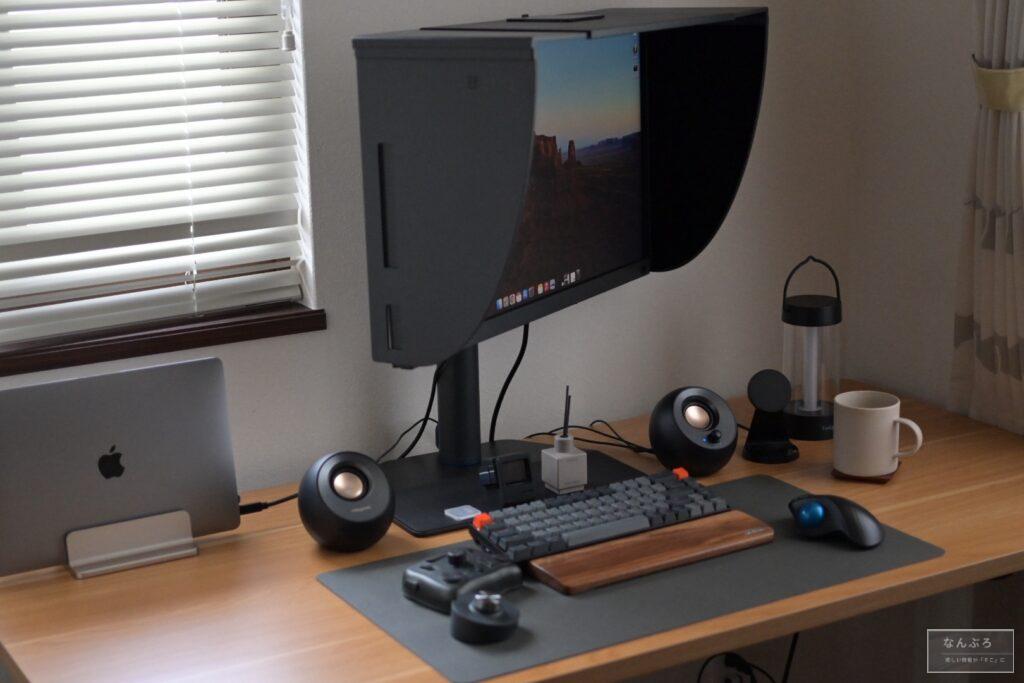 「BenQ SW272Q」の外観(遮光フード取り付け後)はこちらです。ホットキーパック G3はワイヤレス接続となったのでケーブル類もかなりスッキリしてます。