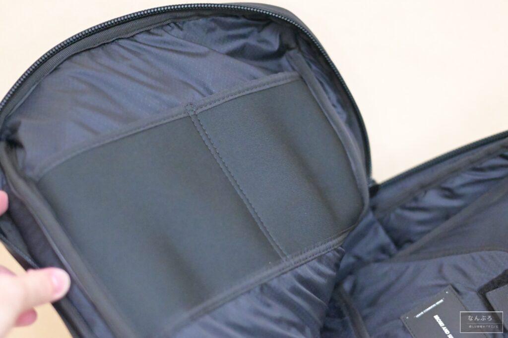 リュックとして使う場合は衝撃を和らげる役割があり、ブリーフケースとして使う場合はシルエットや全体デザインを綺麗に見せる便利なパッドに変身します。
