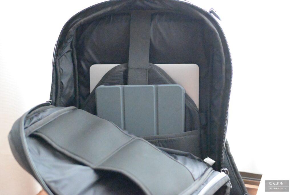 MacBook Air M1とタブレットを収納してみるとこんな感じになります。メインの収納はかなり広いのでパソコン以外にも着替えや書類類などを収納することも可能です。