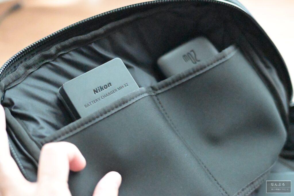 メイン②の収納は、2個の大きなポケットがあります。ここにもカメラのバッテリーやモバイルバッテリーなどを収納することが可能です。