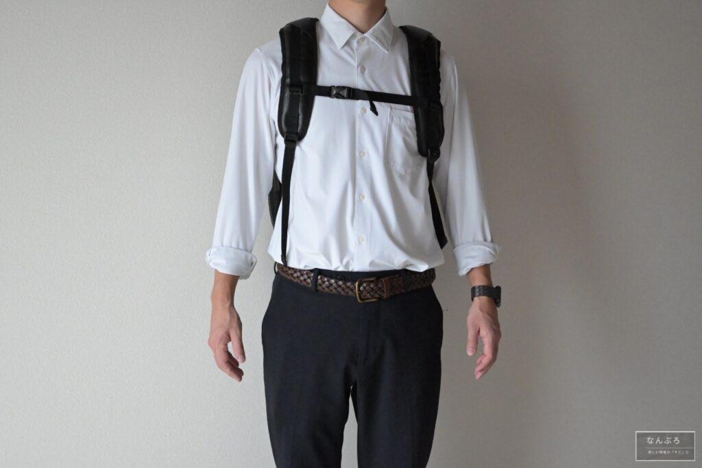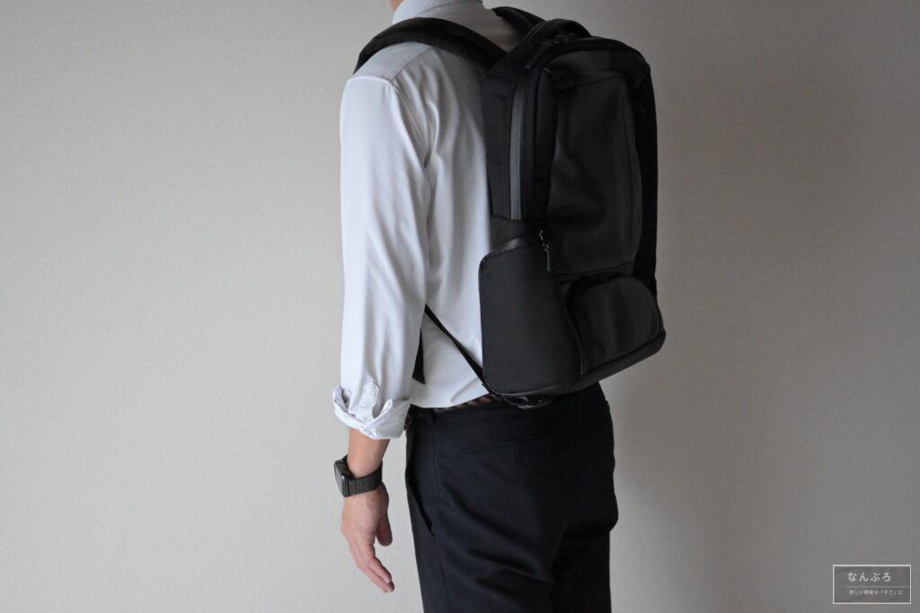 また、ブリーフケースとして使う場合は、リュックの紐を中に入れることでバッグ全体のシルエットがスッキリと見えます。