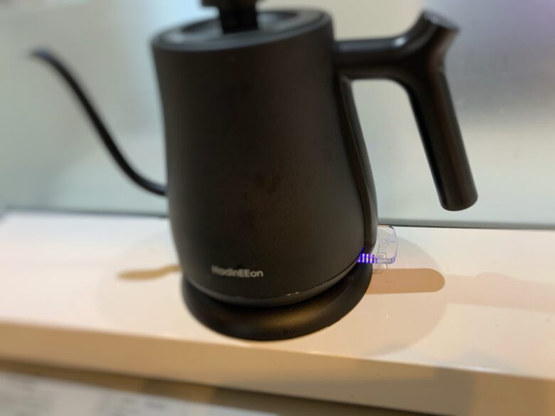 結局、電気ケトルをどこに置くか次第だとは思いますが、今回のHadinEEonはコードの長さが約80mと少し短めです。