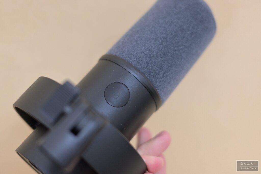 マイクの上にはミュートON/OFFスイッチがあり、底面にはType-C、XLR、ヘッドホンジャック、マイクゲイン調節ダイアル、モニター音量調節ダイアルなどがあります。