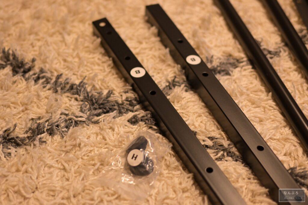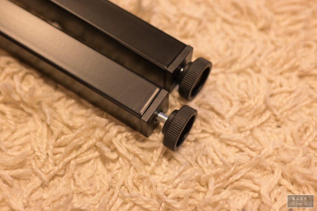 まず、棒の床との設置面に丸いパーツをクルクル回してくっつけます。そして、2本の棒を連結させて1本にします。
