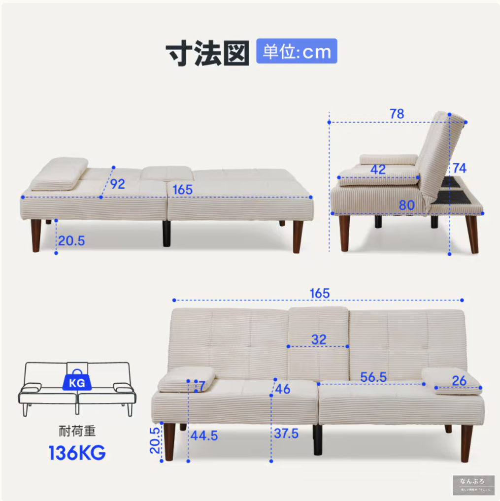 ソファとして使うには十分なサイズかと思いますが、ベッドと考えると少しコンパクトなサイズ感です。