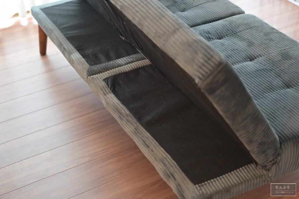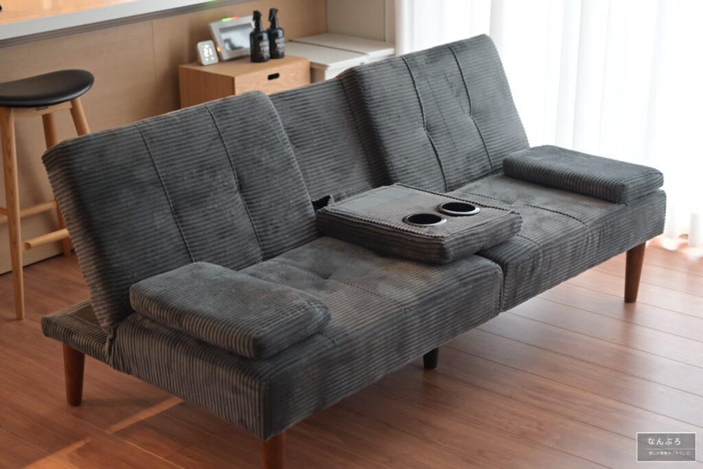 ソファ中央にドリンクホルダーがあるのですが、ベッドとして使うときにこの四角の部分(肘置きとドリンクホルダー部分)が結構硬いです。大人が寝る時にはちょうど背中部分に当たるんですよね。