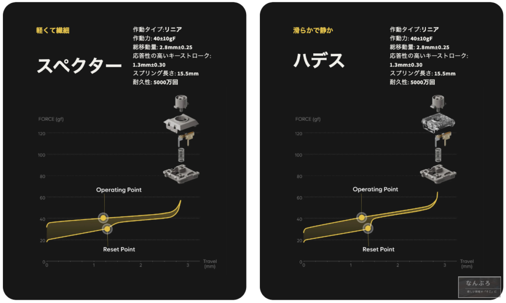 - キースイッチは2種類から選択(スペクター:リニアスイッチ、ハデス:サイレントリニアスイッチ)