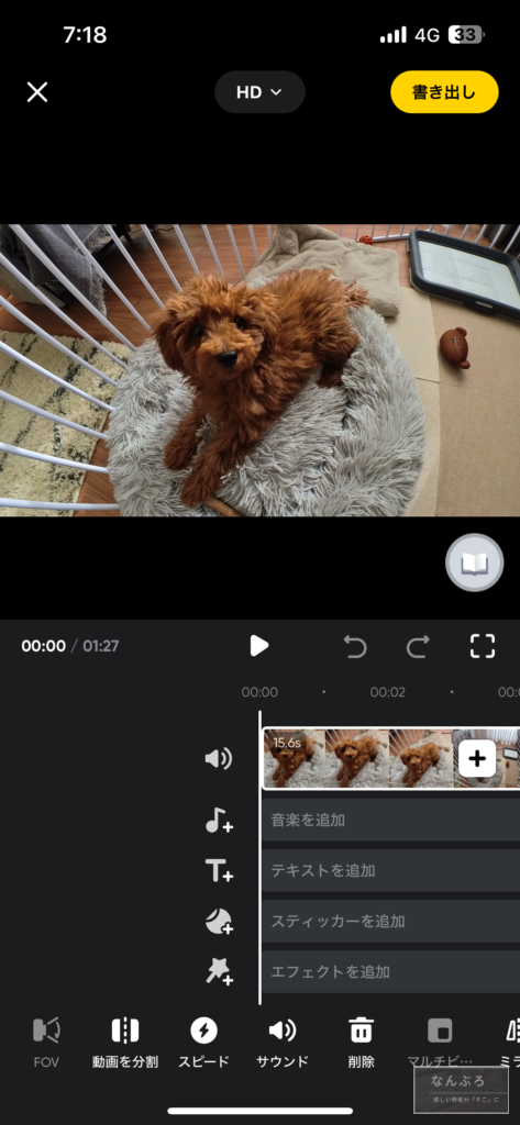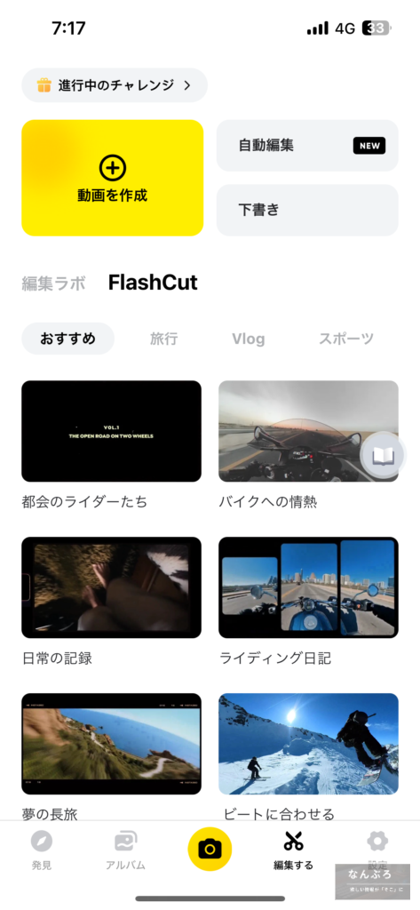 AIで自動編集してくれる機能が結構便利で、この機能を使いインスタやTikTok向けの動画を作るのもありですね。