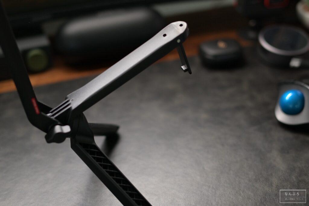 他にもグネッと曲げることができるので、ローアングルでの撮影もできますし、三脚部分にフックがあるので壁に引っ掛けることもできます。