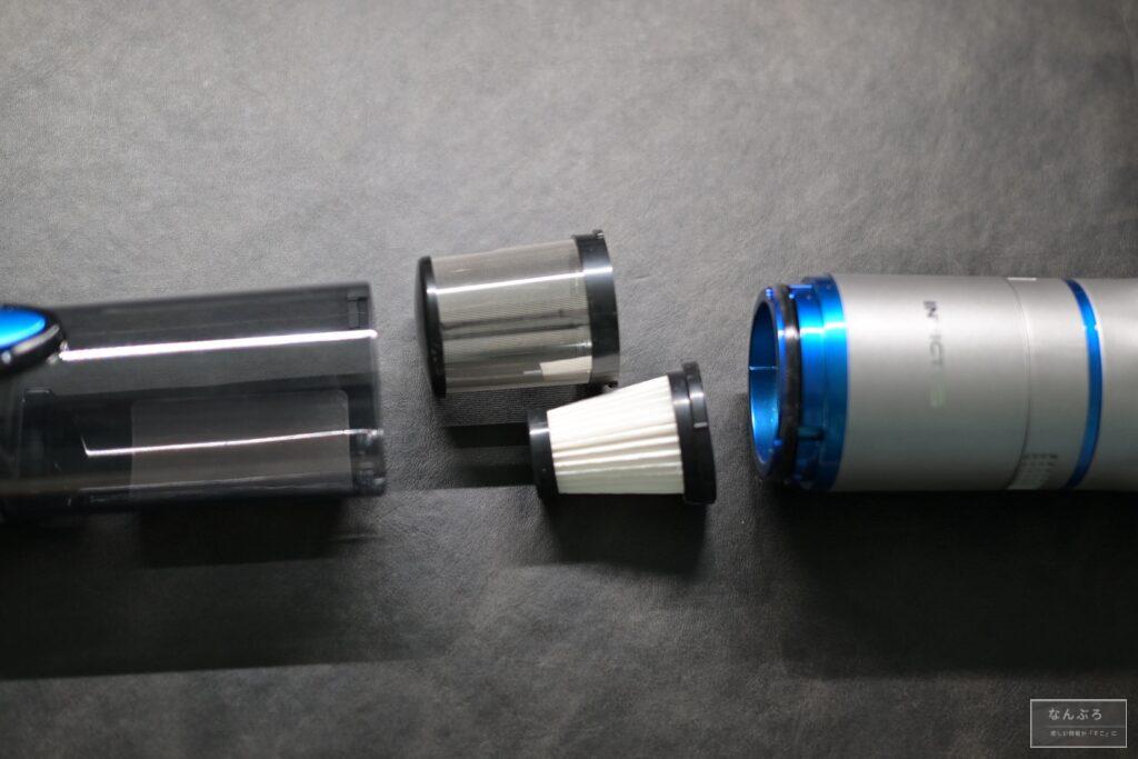 本体のダストボックス部分を回して外せば、フィルターも取り外せるのでゴミが気になるようであれば全て外して掃除することもできます。