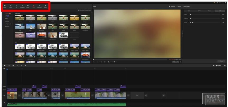無料でも基本的な動画編集が可能 そこまでのPCスペックでなくても使える ちょっと動画編集してみたいなという人向け(一時的に使う人) 無料ソフトとして考えると扱えるBGMが多い気がする | 日本語対応していない 高度な編集はできない フォントやデザインがおしゃれじゃない |