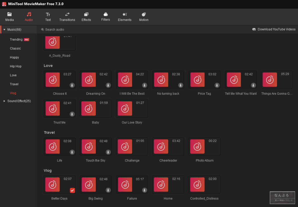 特に無料ソフトだとBGM挿入などは結構限られたりしますからね。MovieMakerなら無料ながらもそこそこ種類が多いです。