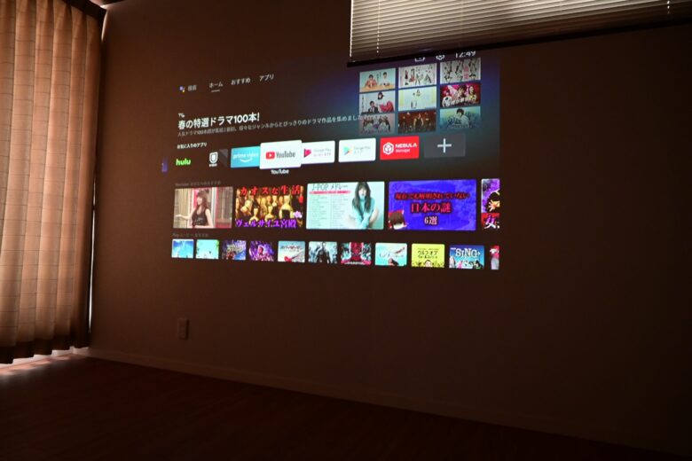 そして、家の白い壁に投影するだけで簡易ホームシアターが完成するため、わざわざスクリーンを購入する必要もありません。