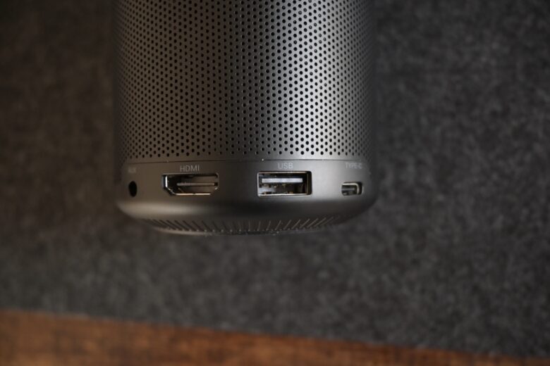 しかも外部接続するインターフェースは背面にあるので、何かを有線で接続した状態でそのまま直置きし真上に投影することは困難です。