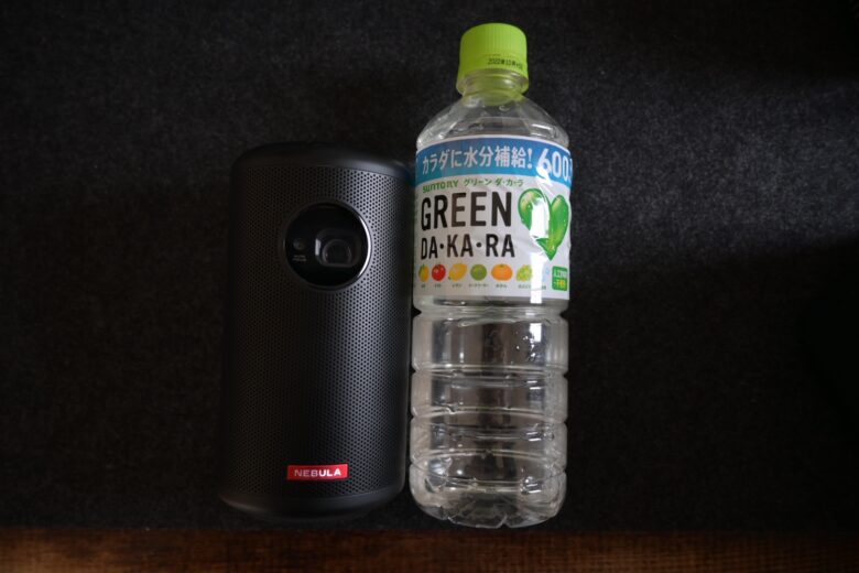 Nebula Capsule IIはかなりコンパクトで500mlのペットボトルと比較してもご覧の通りです。