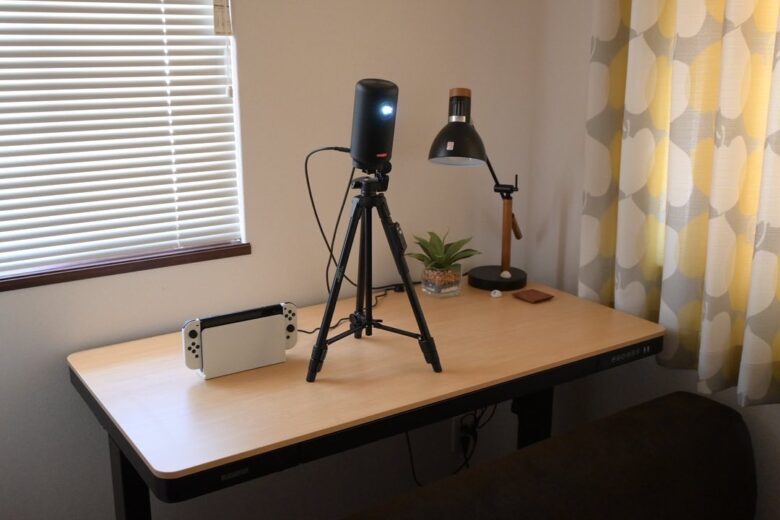 我が家の場合は「電動昇降デスク」の上にNebula Capsule IIを置いて、スイッチのゲーム画面を白い壁に投影しました。