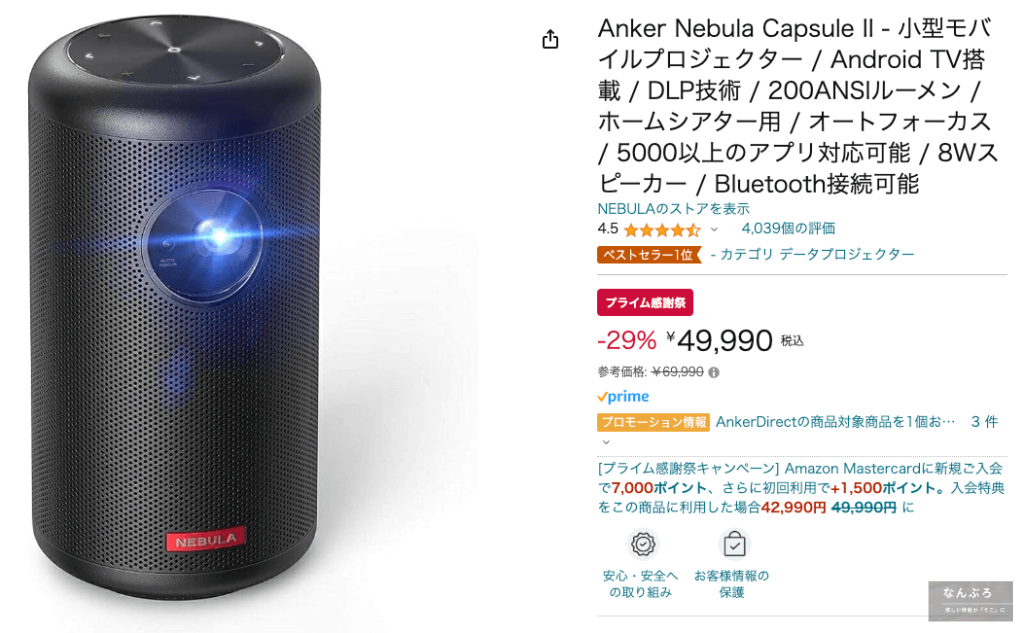 Nebula Capsule IIは通常価格で69,800円と少々高いですが、アマゾンセールで購入することで30%引きで購入できたりします。