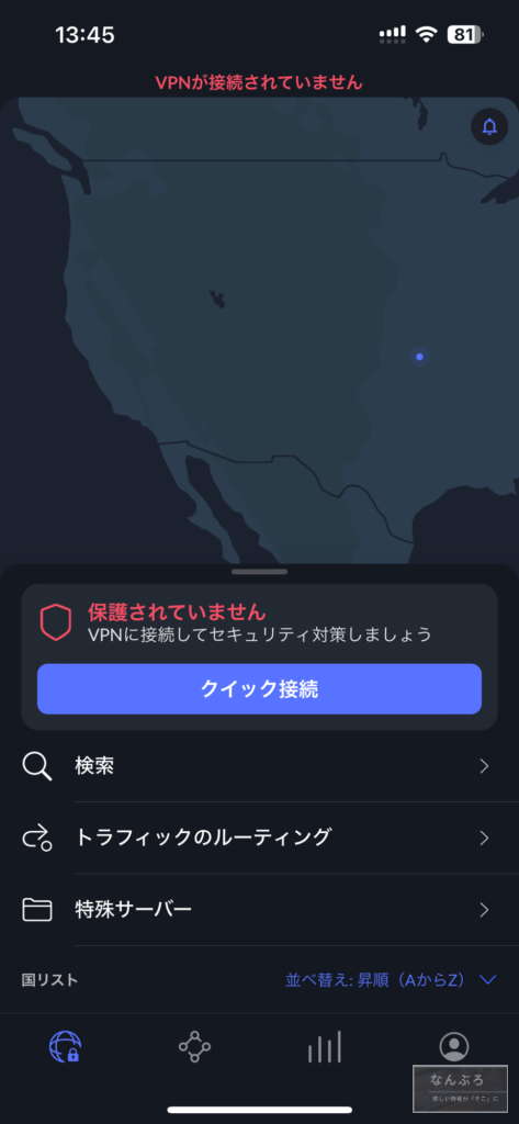 クイック接続するだけで近くのサーバに接続してくれるので操作も簡単です。