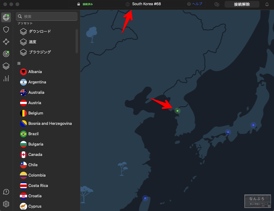 他のVPNサービスは基本的に近くのサーバが自動選択されたりするので、好きなサーバに切り替えできるのは助かります。