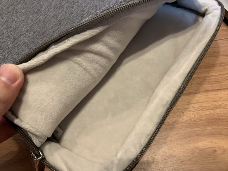 一番大事なパソコンケースの保護機能ですが、3層構造で超協力保護されてます。触った感じもフェルト系なので傷がつくこともなく、高反発クッションが入ってて安心です。