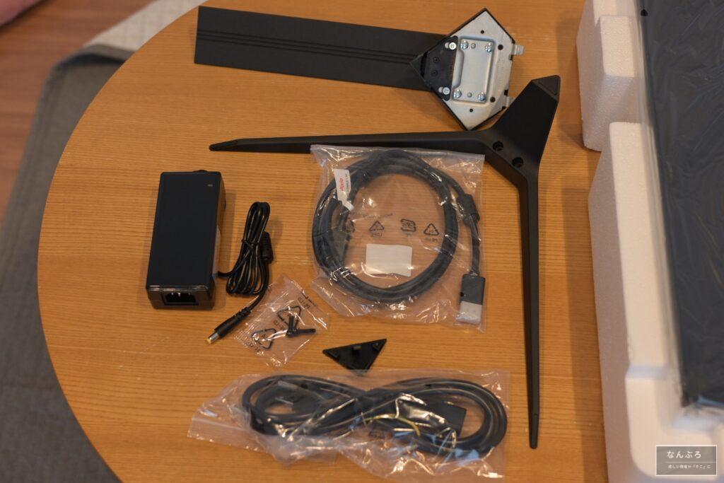 付属ケーブルはHDMIケーブルは入っていなく、Display Port ケーブルのみなのでHDMIケーブルで接続したい場合はご注意ください(Nintendo Switchと接続する場合はswitch側に同梱されているHDMIケーブルを使えばOK)