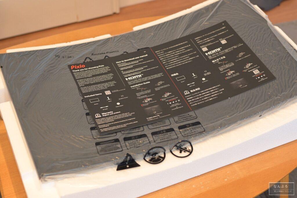 Pixio PXC328モニターの付属品はこちらです。モニターはしっかりした梱包状態で届くので安心です。
