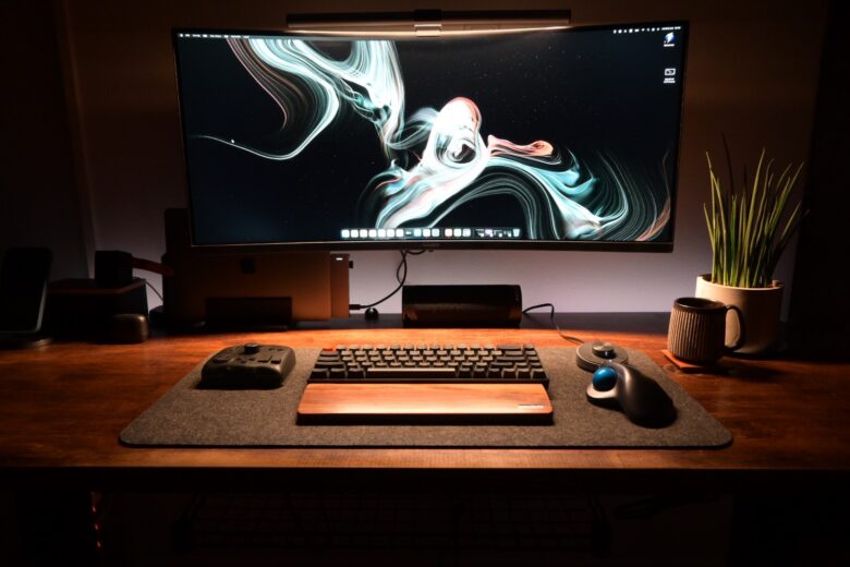 デスクの手元だけピンポイントで照らしてくれる照明、明るさや色味を調整できる手元のコントローラーなど、本当に考えられたモニターライトですよね。