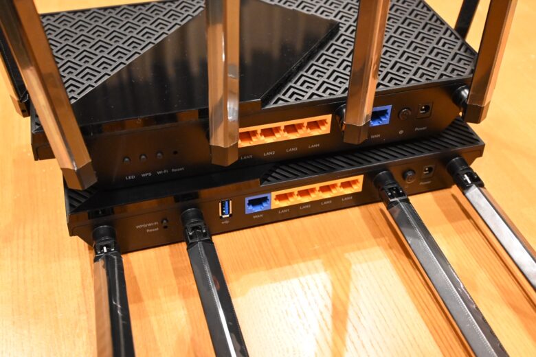 Archer AX73(上)とArcher AX55(下)とを上下に並べてみると、LEDランプの違いがわかりますね。
