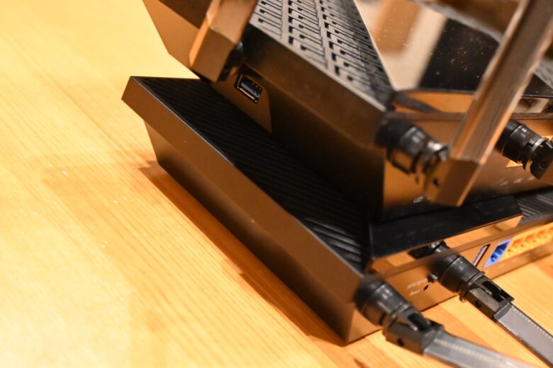 これがその横からの写真ですが、上のArcher AX73にはUSBポートがあるのがわかるかと思います。