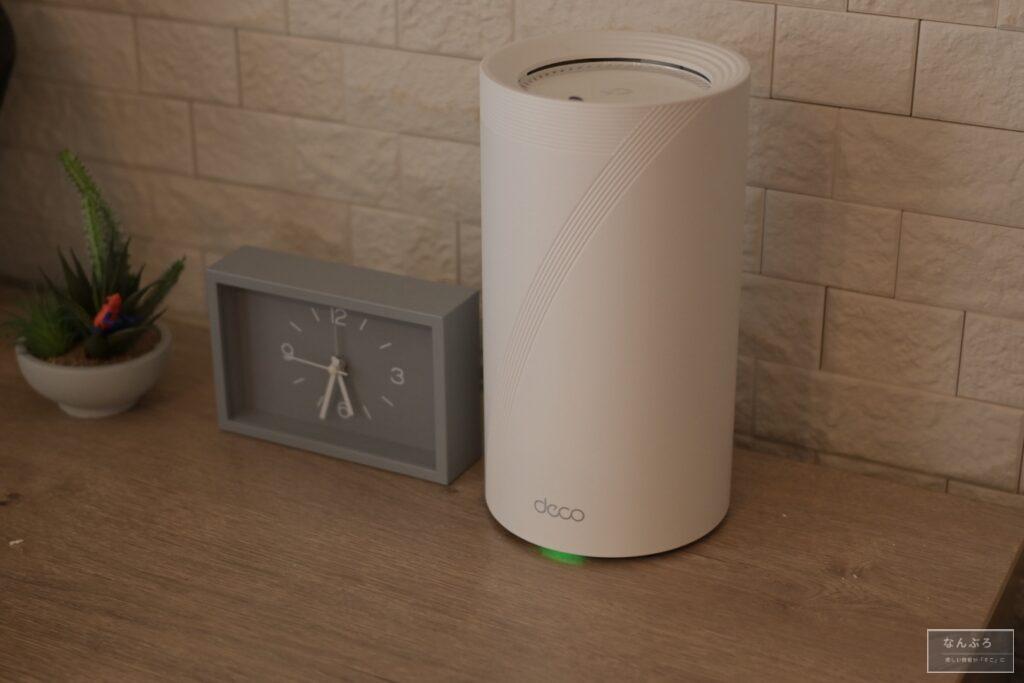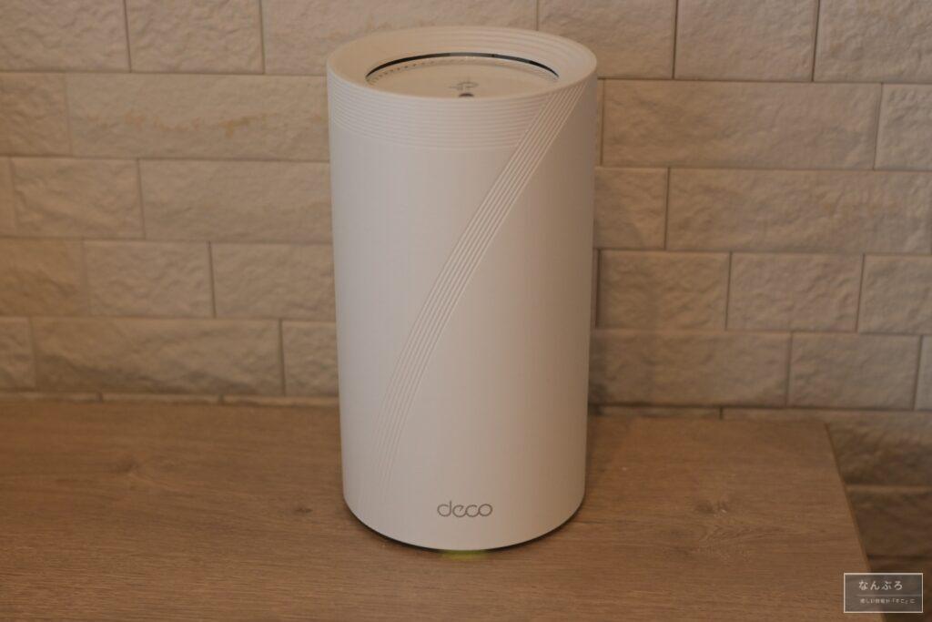 「TP-Link Deco BE75」の外観はこんな感じです。丸いフォルムなのでWi-Fiルーターっぽくなく清潔感あるのがGood。