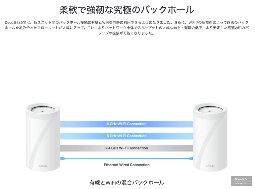 Deco BE85は各ユニット間のバックホール接続に有線とWi-Fiを同時に利用できます。
