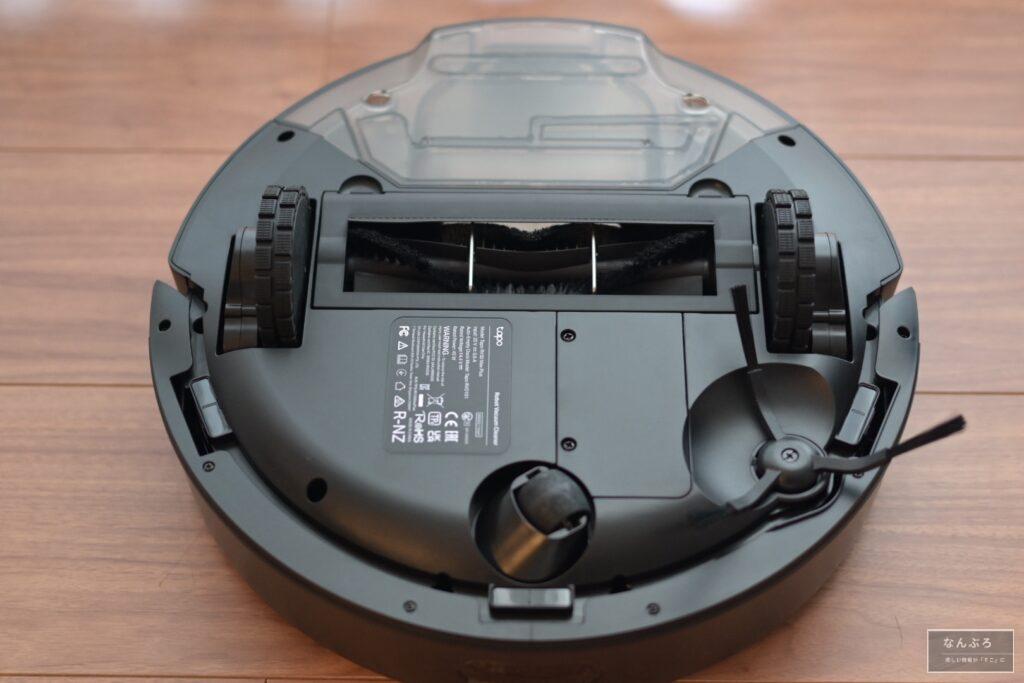 お掃除ロボットの表面や裏面はいわゆる一般的なお掃除ロボットの見た目です。裏面にあるブラシが回転してゴミを吸い込みますし、水を入れてモップを取り付けると水拭きができます。