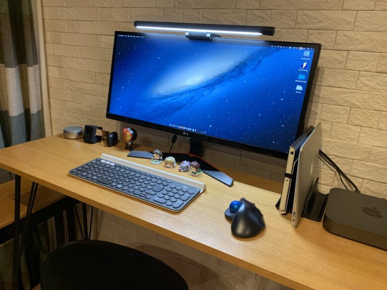 基本的に無駄な物は置いていないのですっきり見えますし、Mac miniなので省スペースで済みます。