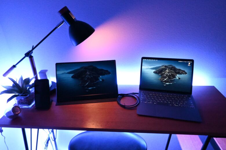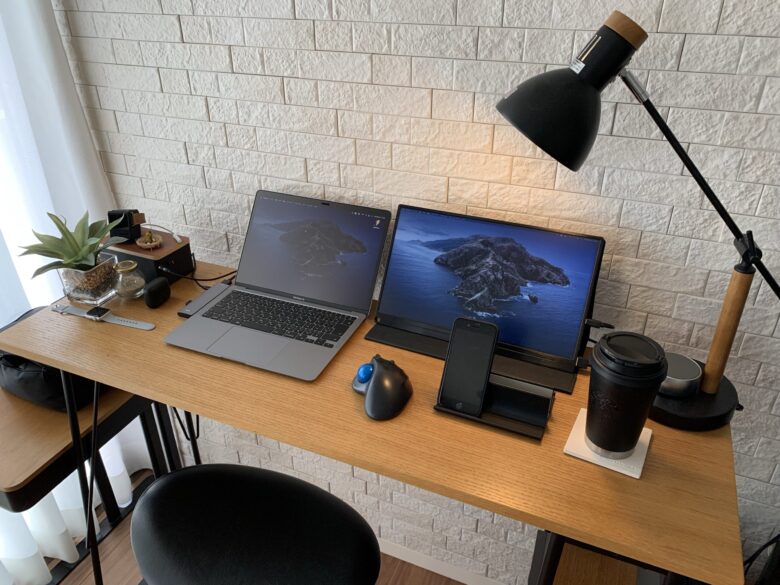 MacBook Airは画面も小さく見づらく感じてしまいますが、モニターをモバイルディスプレイにすることでここまですっきりしたデスク周りにもできます。