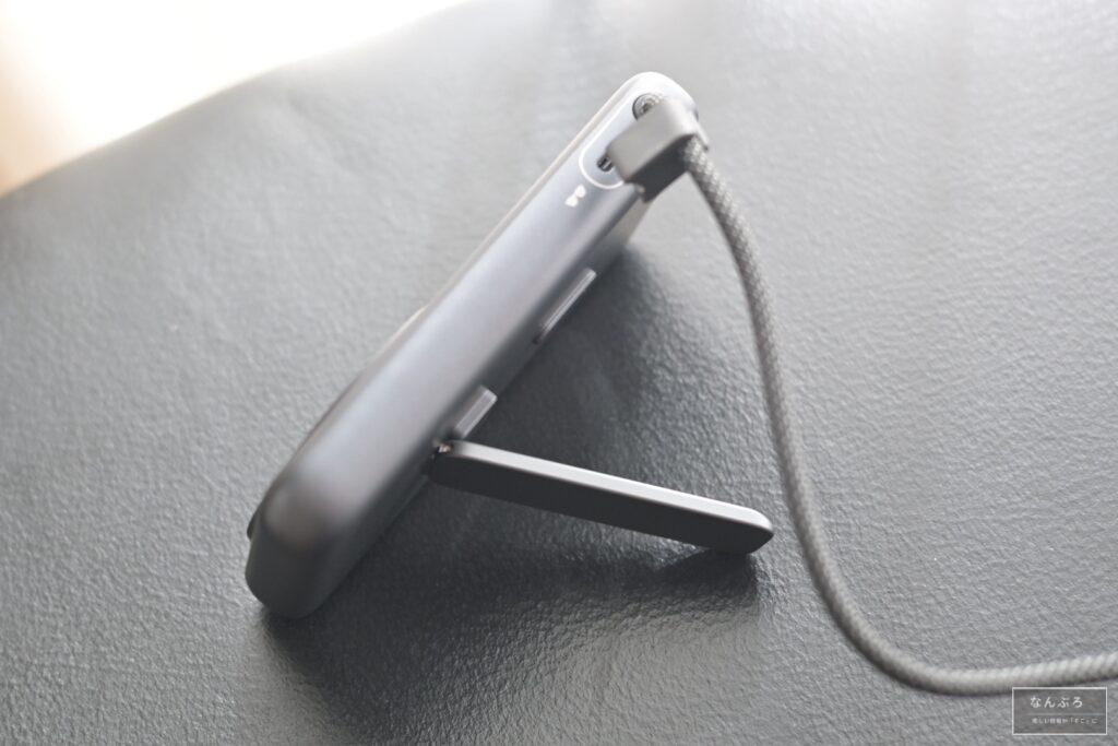 モバイルバッテリーになっているのでスマホの充電だってできますし、充電しながらも使えます。あと、スタンド的な使い方もできる。