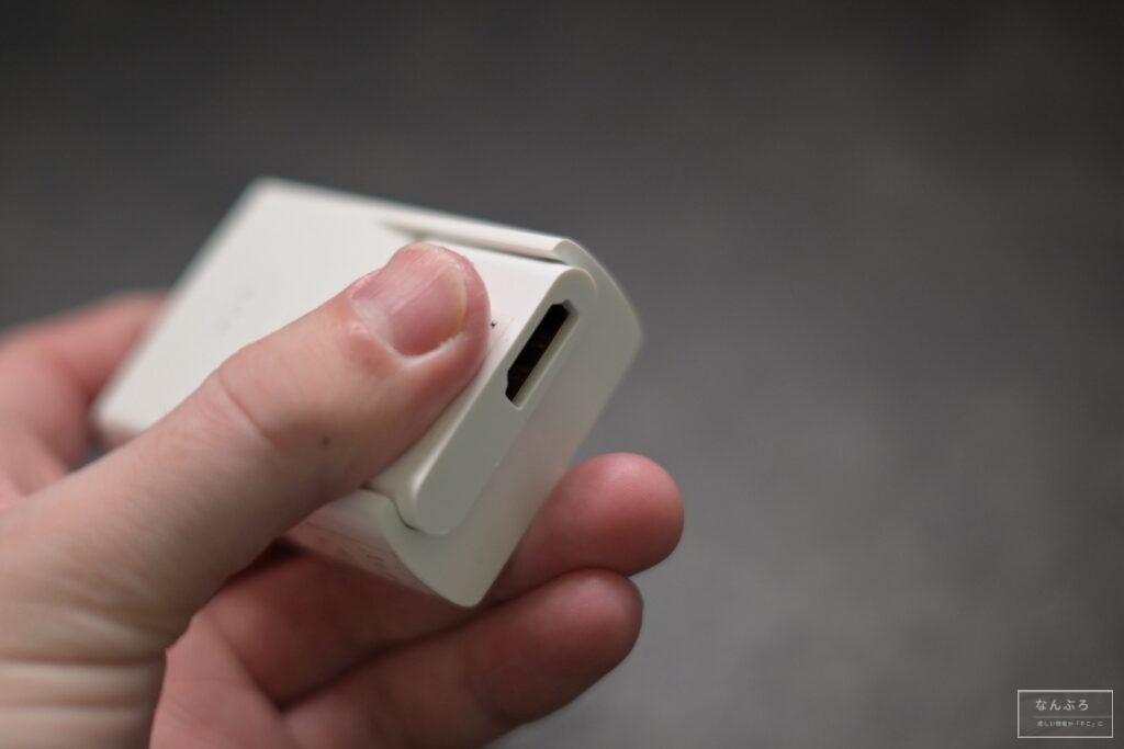 Type-Cポート、電源ボタン、LED(バッテリー残量)がある側と、反対側にはHDMIを接続するポートがあります。