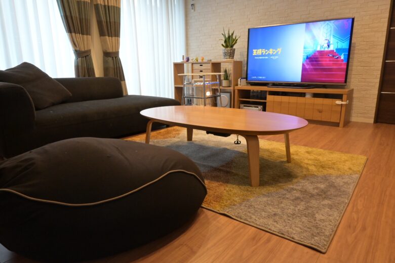 ちなみに、テーブルの正面にヨギボー(Yogibo)を置くと、こんな感じです。